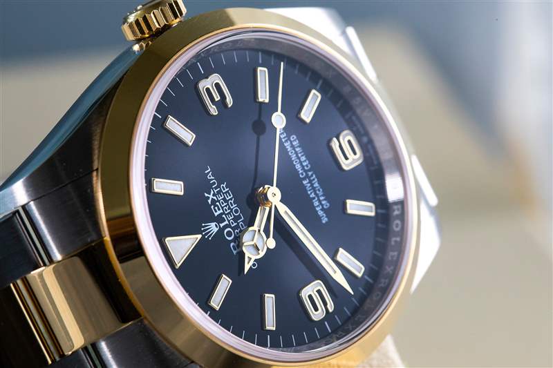 雖然表盤仍然是經(jīng)典的3-6-9 Explorer表盤,具有光澤的黑色漆面,但最近的縮小確實(shí)影響了一些小元素,在這里和那里。“Explorer”文字已從六點(diǎn)鐘位置移回12點(diǎn)鐘位置,“最高級(jí)天文臺(tái)表/官方認(rèn)證”簽名的間距更大,以填補(bǔ)下半部分。這可能是一些奇怪的視覺錯(cuò)覺,但在我看來,新表盤看起來比214270上的表盤更干凈,更不局促,盡管將相同的信息打包在更少的空間中。在雙色版本的手表上,金色指針和刻度增添了大量的視覺溫暖,讓我想起了20世紀(jì)60年代初的鍍金表盤。