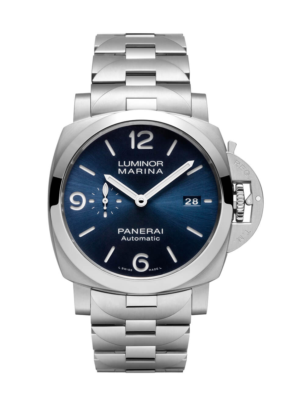 Luminor Marina Specchio Blu 采用沛納海于 2017 年推出的全新精鋼一體式表鏈,與 Luminor 標志性表冠護罩的輪廓相呼應(yīng),每個鏈節(jié)上都有凸起的半圓形部分,同時通過交替排列拋光和緞面鏈接。