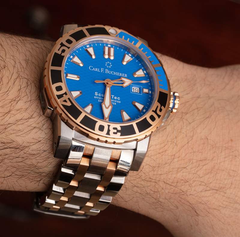 多年來佩戴了幾款 Patravi ScubaTec 手表后,我開始真正欣賞 Carl F. Bucherer 在該系列中的正確之處,這些手表如何既舒適又符合人體工程學,以及這些作品與其他類似價格的“奢華生活方式”相比如何” 潛水表。當我第一次在 Patravi ScubaTec 手鐲版上佩戴這款鋼和 18k 玫瑰金時,我真正想到的是,佩戴體驗非常像上一代百年靈 Chronomat 或其他類似的手表,很重(字面意思)很好- 拋光金屬,給人一種堅實而舒適的感覺。鑒于迷人的拋光表面以及光線如何在表殼和表鏈設計的多個角度和側面上反射,手腕上也會出現非常珠寶般的存在。