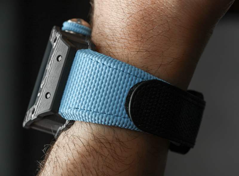 從手腕上欣賞手表也不難。Richard Mille 再次使用 TPT 碳作為表殼材料,這是一種層狀的碳,經久耐用且非常好看。RM53-01 表殼寬 44.5 毫米,高 49.94 毫米(凸耳到凸耳)和 16.15 毫米厚(防水深度達 50m)。復雜的表殼設計與有趣的表帶系統(具有有效但具有諷刺意味的非豪華 Velcro 閉合系統)相結合,使框架能夠展示對稱和視覺上引人入勝的內部運動。