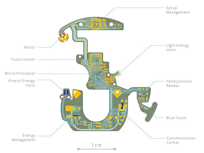 在處于靜止狀態后輕敲兩下手表的水晶,可以喚醒 e-Crown 系統。即使在睡眠模式下,系統也會保持正確的時間,然后使用其機械系統繼續在 ROCS 模塊中設置正確的時間。之后,ROCS 模塊由位于模塊堆棧最低層的手表內部的機械自動機芯提供動力。使用 e-Crown 是完全可選的,如果用戶愿意,他們可以簡單地手動設置時間并假裝手表完全是傳統的。