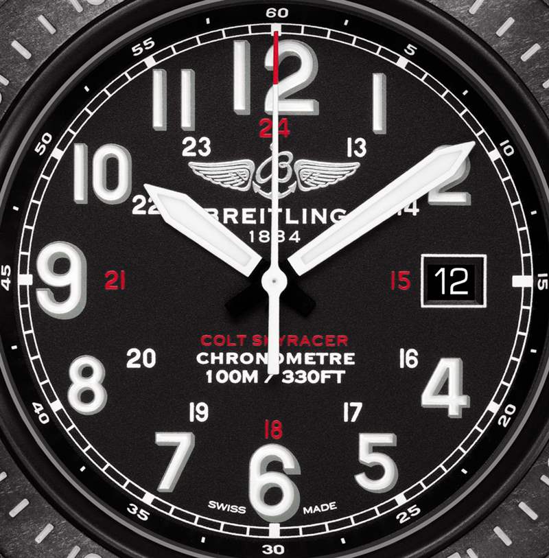 百年靈 Colt Skyracer 的表盤易讀性非常好。夜光指針和標(biāo)志性的阿拉伯小時數(shù)字既合理又不會太嚴(yán)肅。我很喜歡百年靈能夠在設(shè)計中融入健康的個性——這對于奢侈手表來說很重要,因為人們選擇購買它們總是有一個獨(dú)特的元素。表盤上還有一個專用的 24 小時軍用時間刻度以及一個日期指示器窗口。這是保守的工具表盤的一個很好的例子,它也設(shè)法不乏味。
