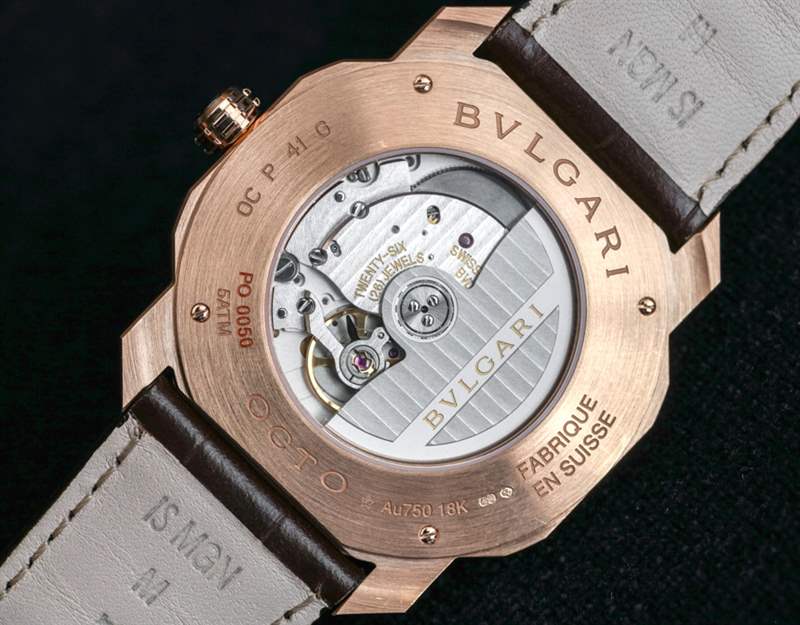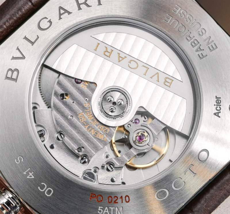 Bulgari Octo Roma 內(nèi)部是 Bulgari 內(nèi)部制造的 Calibre BVL 191 自動(dòng)機(jī)芯,可以從表殼背面??透過藍(lán)寶石水晶窗看到。機(jī)芯以 4 赫茲(28,800 次/小時(shí))的頻率運(yùn)行,動(dòng)力儲(chǔ)存約兩天。BVL 191“Solotempo”機(jī)芯在 3 點(diǎn)鐘位置提供帶秒針的時(shí)間和日期指示窗口(不會(huì)切斷時(shí)標(biāo))。