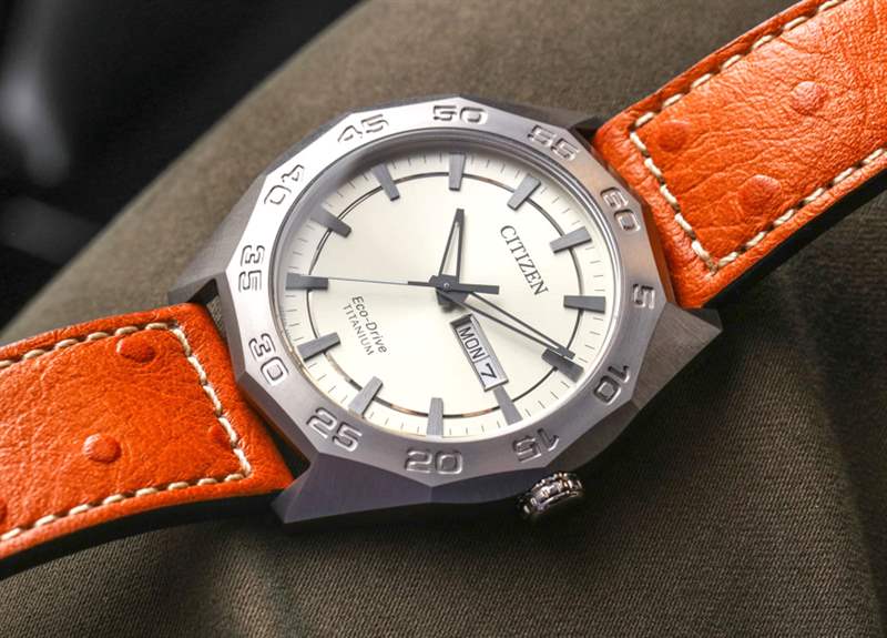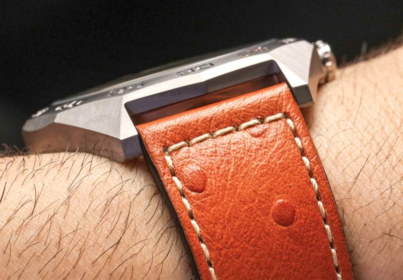 這讓我對那些和我一樣喜歡 Eco-Drive Super Titanium 的人提出了一個奇怪的建議。獲取 AW0060-03E 表盤,然后是手鐲上的其中一個型號(例如 AW0060-54A),然后將手鐲換成皮革表帶。表帶實際上很好看,但你可能知道我是手鐲的傻瓜,所以我更喜歡它。兩條皮表帶外側有鴕鳥紋,看起來還不錯,不像廉價的假鱷魚紋。在評測過的手表上,表帶是黑色的,帶有橙色縫線以匹配秒針。請注意與表殼設計主題相匹配的定制表帶扣。