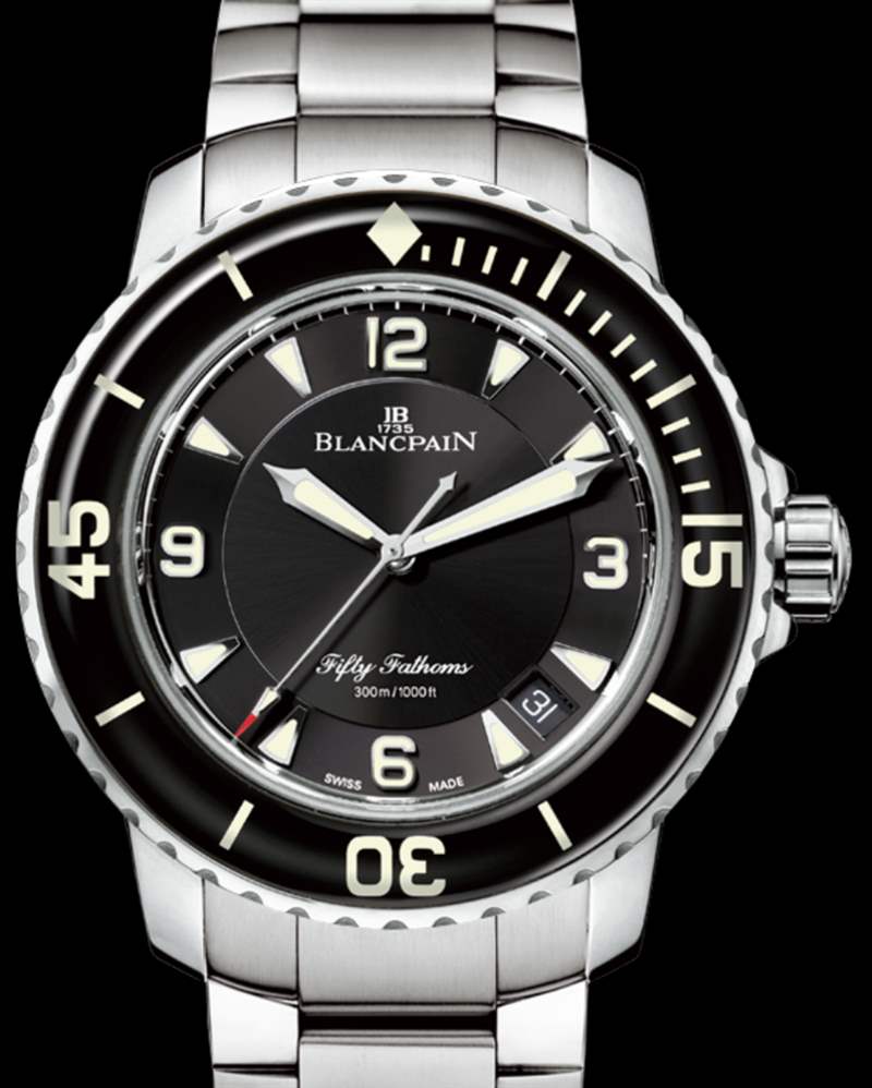 優勢:?45 毫米寬和內部機芯,寶珀五十噚 Automatique 5015(aBlogtoWatch 評論在這里)系列有一個可用的鋼模型,帶有匹配的表鏈和黑色表盤,在主題上與勞力士潛航者相同。它很昂貴,但它也制作精良且美觀。