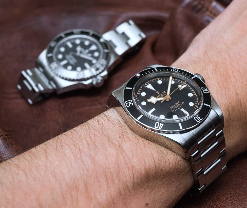 比較: Tudor Black Bay 比 40mm 勞力士 Submariner 略大,帶有 41mm 寬的鋼制表殼,也更厚一些。也許最大的“缺點”是它的鋁制表圈插入材料與勞力士 Submariner 更耐用的陶瓷相比——盡管您確實在 Heritage Black Bay 中獲得了更多有趣的顏色選擇,例如酒紅色。實心表盤設計在歷史上受到勞力士 Submariner 的啟發,因此差異很小,但很明顯。