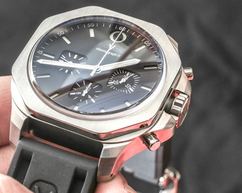 MoVas Military Chronograph II 是一款相當大而重的鋼制手表,采用 45 毫米寬的方形/墊形表殼,厚度也約為 17 毫米。MoVas 提供藍寶石水晶和有機玻璃水晶兩種選擇,這實際上是為了提供有機玻璃水晶所提供的獨特溫暖——但當然,并非所有買家都希望處理與藍寶石相比它更容易劃傷的事實。該表殼還可以防水 100 米——沒有旋入式表冠或旋入式按鈕——即使歐洲和日本品牌在許多方面都擊敗了 MoVas,也感覺制作精良。話雖如此,這感覺更像是一款高度精致的“項目”手表,而不是出廠時的東西,這或多或少是 MoVas 手表的樣子。