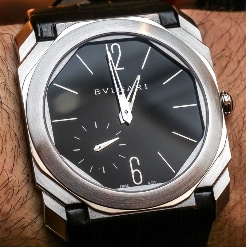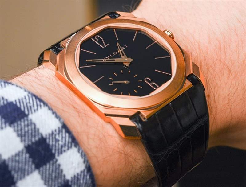 寶格麗 (Bulgari) 改進了表盤的易讀性,最初采用超亮黑漆表盤和拋光立體時標和指針。事實上,金色的表盤看起來特別漂亮——但話說回來,Octo 風格的表殼在鋼/白金/鉑金色調中看起來確實非常漂亮。您可能想知道 Octo 表殼(通常較厚)是什么樣子……好吧,“扁平”。我有點擔心這一點,但在大多數方面,標準 Octo 的表殼幾乎完全相同——只是薄了幾毫米。保留了有吸引力的對比拋光,主要是拉絲表面,但也有一些從側面最容易注意到的漂亮拋光表面。鑲嵌在表冠上的是黑色凸圓形陶瓷。廣告留言廣告信息結束