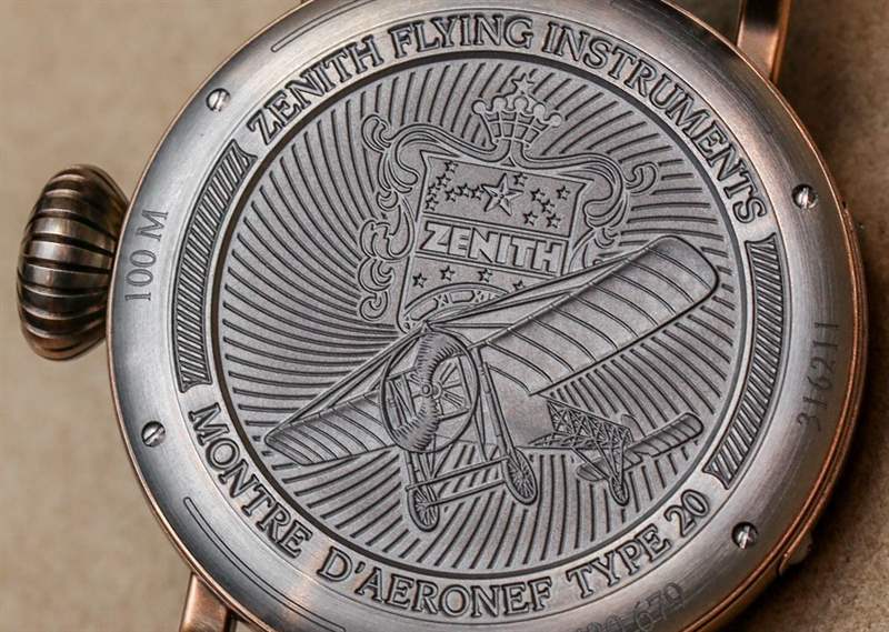 Zenith Pilot Type 20 Extra Special Bronze 表殼防水深度達 100 米,雖然大部分采用青銅材質,但表背采用鈦金屬雕刻,帶有炫酷的 Zenith 飛機圖案。鈦是一種更好的底蓋材料,因為青銅對人的皮膚的反應并不總是那么好(除非你想讓你的皮膚變綠一點)。