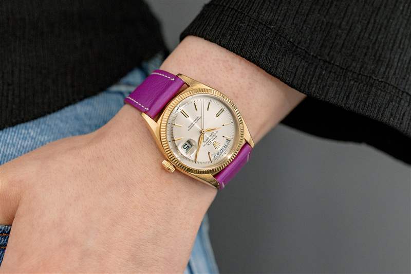 幾十年來星期日歷型并沒有太大變化;這在我的書中得分。如果你說一口流利的復(fù)古勞力士,這里有一些線索可以指出這個(gè)星期日歷型的日期有多早(1961 年)。第一個(gè)更明顯——阿爾法手。這種風(fēng)格是您在 1950 年代結(jié)束的古董勞力士手表的“泡泡背”時(shí)代發(fā)現(xiàn)的那些風(fēng)格的遺留物,因?yàn)槠渲性S多參考具有相似形狀的指針。知道了這一點(diǎn),我們的例子開始顯示它的年齡,同時(shí)在 2022 年看起來并不格格不入。此外,這款手表的表盤沒有采用常見的勞力士旭日紋飾面,直線從中央小齒輪延伸到表盤邊緣;我們的表盤采用同心圓飾面。圓圈從中心發(fā)出并遠(yuǎn)離中心,1961 年勞力士 Day-Date Ref.?1803