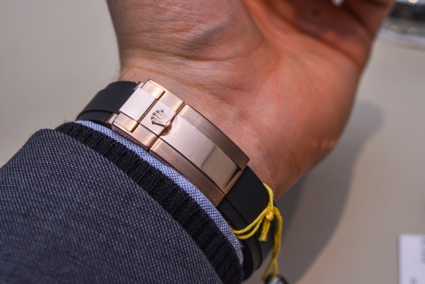 Oysterflex 非常酷,實際上,我確實希望勞力士將這種新的表帶選項推廣到其他手表。我們可能會在未來看到這一點,但勞力士并沒有多說。Oysterflex 并非由天然橡膠制成,盡管它的觸感幾乎與天然橡膠一模一樣。手鏈的結構以金屬“刀片”(鈦鎳合金)開始,形成基本形狀并使其牢固貼合。表帶上最有趣的元素之一是下方的“鰭狀物”,旨在在表帶和手腕之間形成緩沖。這允許您的手腕稍微伸展和收縮,同時表帶保持舒適和貼身,并且還有助于在炎熱的天氣里讓表帶的內部稍微通風。這是一款由“彈性體”材料制成的手感極佳的表帶,連接到 18k 玫瑰金展開式表扣。
