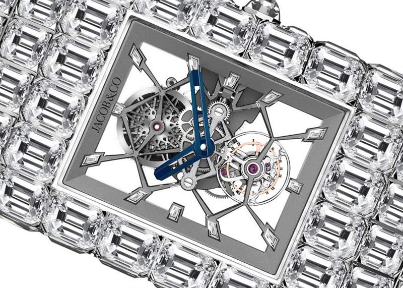 Jacob & Co. Billionaire 手表也不小巧。雖然它在圖片中看起來(lái)像是一款女表,但表殼寬 47.5 毫米,高 58 毫米。在某處有一個(gè)手表機(jī)芯和表盤(pán)的實(shí)際外殼。這個(gè)矩形元素由 18k 白金制成,并裝有 Jacob & Co. 獨(dú)有的機(jī)械機(jī)芯。