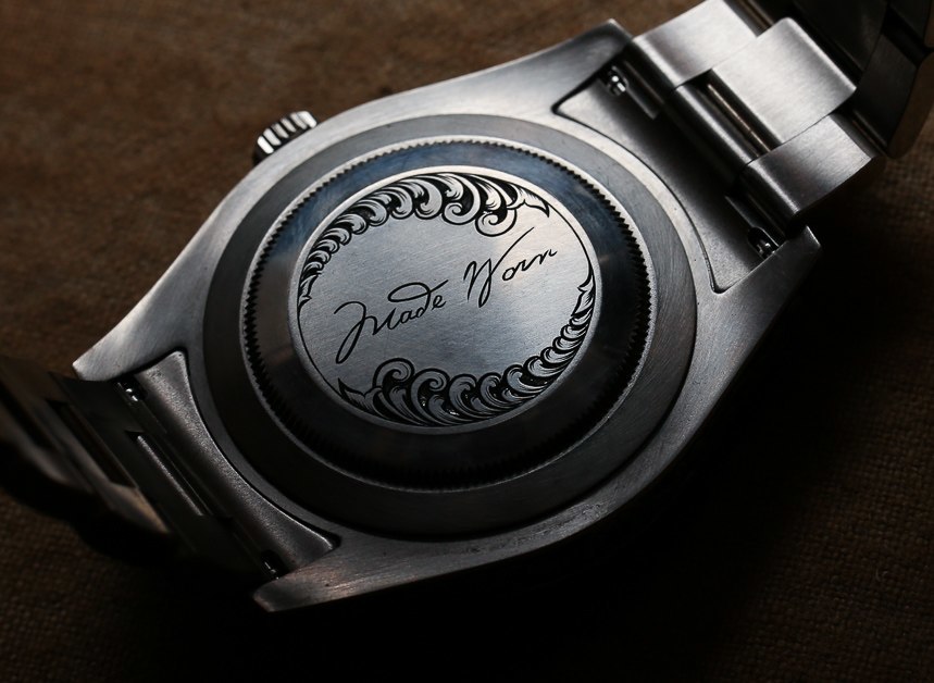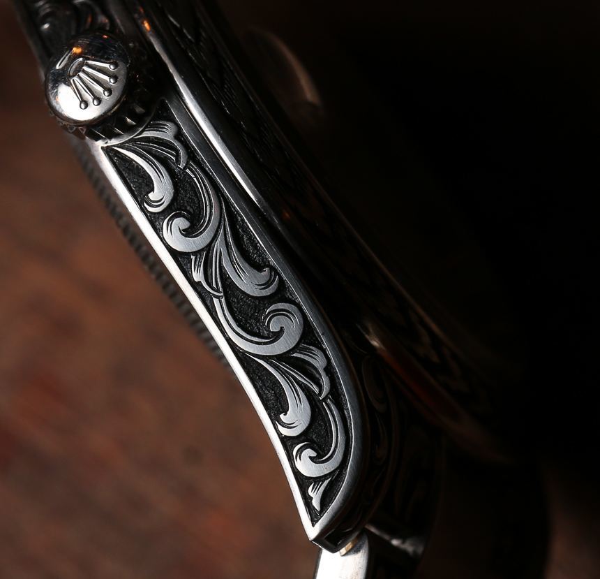 說到手工勞動,我不得不問 Halvorson,雕刻師在裝飾這些勞力士手表的表殼和表鏈時是否遇到了問題。現代勞力士時計使用一種非常堅硬的鋼材,即 904L 合金。除了非常耐腐蝕之外,904L 鋼還很難加工。雕刻師通常喜歡使用較軟的金屬,如金、銀或黃銅。雖然我沒有機會與雕刻師討論,但 Blaine 確實回應說,雕刻師對每只手表雕刻的難度提出了很多抱怨。