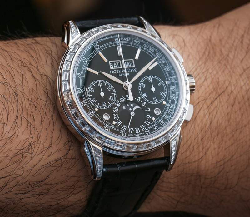 兩款 2014 年百達翡麗 5270G 型號采用 18k 白金材質,而 5271P 則采用鉑金材質。白色表盤的是百達翡麗5270G-013,藍色表盤的是5270G-014。百達翡麗 5270 的其他黃金版本尚未發布。我不太清楚為什么 5271 有不同的名字,但我只能假設是因為它帶有很多鉆石裝飾。雖然機械表純粹主義者通常對鉆石興趣不大,但百達翡麗在許多客戶對其鐘表的鉆石裝飾感興趣的國家/地區擁有強大的影響力。因此,百達翡麗 5271P-001 的鉑金表殼以及表圈和表耳上的 58 顆長方形切割鉆石(約 3.63 克拉)使其對某些客戶特別有吸引力。