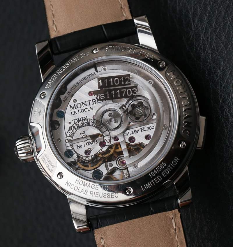 透過(guò)藍(lán)寶石水晶底蓋可見(jiàn)瑞士力洛克自制MB R200自動(dòng)機(jī)芯。這個(gè) 4Hz 機(jī)芯代表了萬(wàn)寶龍的 ETA 機(jī)芯和他們更高端的萬(wàn)寶龍 Villeret (Minerva) 生產(chǎn)的機(jī)芯之間的中間值。這款手表的時(shí)間帶有第二時(shí)區(qū)指針(基本上是一個(gè)額外的時(shí)針)、晝/夜指示器、日期和通過(guò)單按鈕(單按鈕計(jì)時(shí)碼表)操作的 30 分鐘計(jì)時(shí)碼表。該機(jī)芯具有 3 天(72 小時(shí))的良好動(dòng)力儲(chǔ)存。