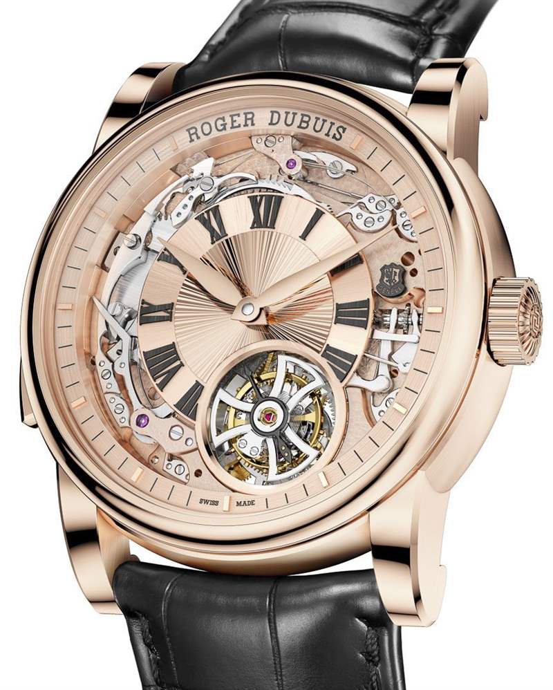 腕間,羅杰杜彼Hommage三問陀飛輪自動腕表寬45毫米,目前獨(dú)家提供18k玫瑰金款。未來的版本可能會采用其他材料(例如 18k 白金),但不是一開始就提供。18k 玫瑰金表盤和指針進(jìn)一步彰顯了奢華主題,從表盤上看,它們與機(jī)芯的玫瑰金色調(diào)區(qū)域完美融合。大而華麗是當(dāng)今 Roger Dubuis 的慣用手法,也是對他們有用的東西,因?yàn)樵谒麄兊膬?nèi)心深處,它們是真正的傳統(tǒng)瑞士手表。從任何其他角度來看,像這樣的作品很容易因?yàn)槠浼兇獾钠嬗^和過度而被認(rèn)為是非常令人討厭的。