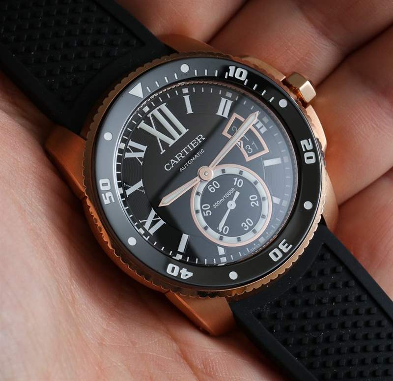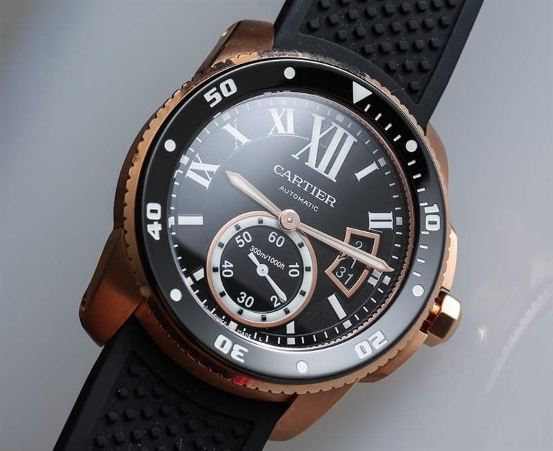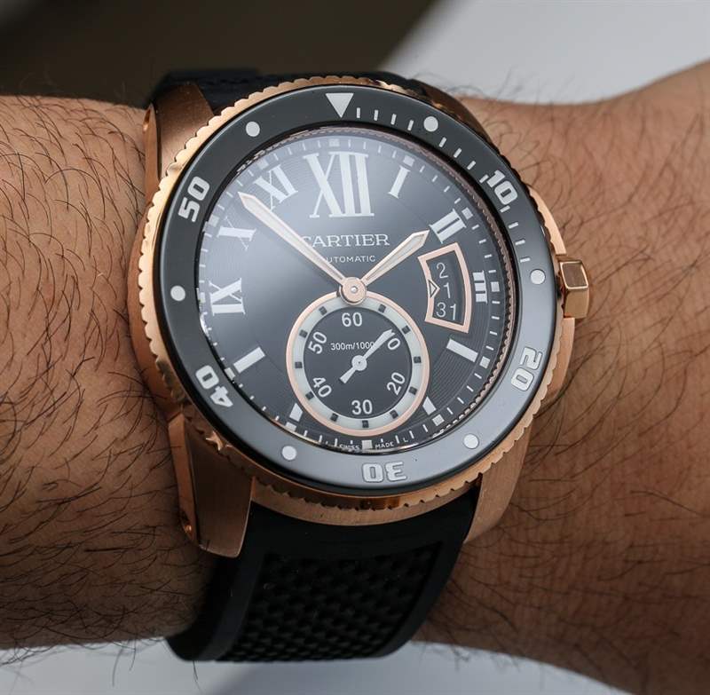 當卡地亞 (Cartier) 正式推出卡地亞 Calibre Diver (卡地亞 Calibre Diver) 腕表時,aBlogtoWatch 于 2014 年初在這里進行了親身體驗。在那里您可以看到精鋼版本和 18k 玫瑰金版本的實際操作圖像。明明是運動手表,我們?yōu)槭裁匆獙彶辄S金版?嗯,首先,我覺得黑色表盤搭配玫瑰金表殼很醒目,其次,我覺得既然是一款奢華的生活方式運動表,為什么不把奢華的元素發(fā)揮到淋漓盡致呢。