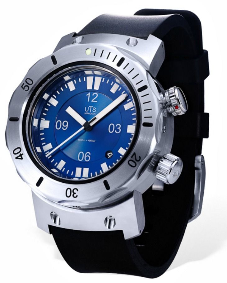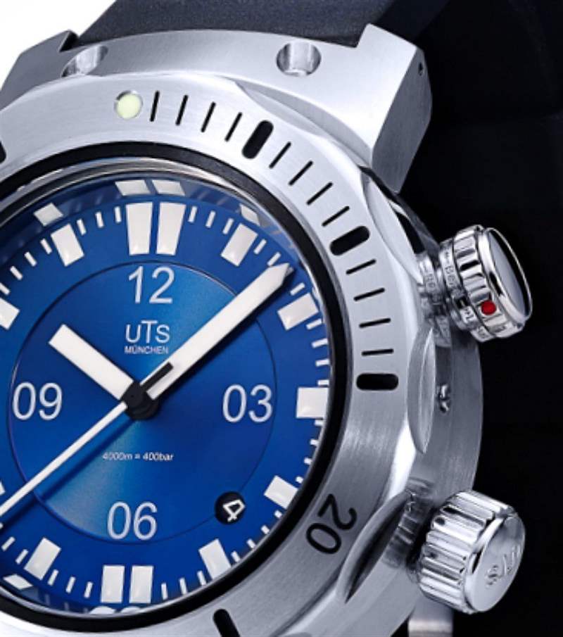 UTS 在德國用德國鋼材為他們的每只手表生產表殼,它們不是沖壓而是單獨打磨。它們具有獨特的表耳設計,在許多方面簡單地體現了工具表的外觀。朋友們,這是實用潛水表的原型。UTS 4000M Pacific Horizo??n Blue腕表寬45毫米,厚17.5毫米——畢竟防水深度達4000米。如果您想要更薄的 UTS 手表,他們也有。盡管如此,人們似乎發現 UTS 4000M 每天都非常適合佩戴。