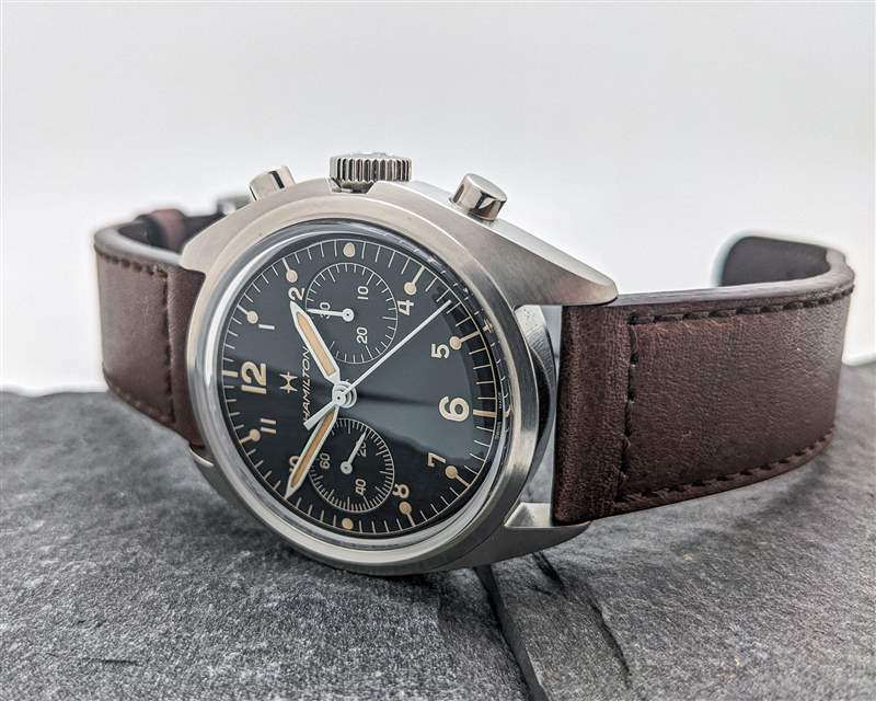 漢米爾頓為 Khaki Pilot Pioneer 機械計時碼表搭載 H-51-Si 手動上鏈計時機芯。H-51-Si 是可追溯至 Valjoux 7753 的血統中的最新發展,但盡管基本平臺年代久遠,但這是一款堅固的現代動力裝置。除了高端硅游絲外,H-51-Si 還提供強勁的 60 小時動力儲存,振頻為 28,800 bph。H-51-Si 計時碼表的按鈕動作出奇地輕巧,但足夠靈敏,可以在操作過程中提供令人愉悅的觸覺反饋。該機芯的準確性也很可靠,在我們的審查期間平均每天 +5 秒。