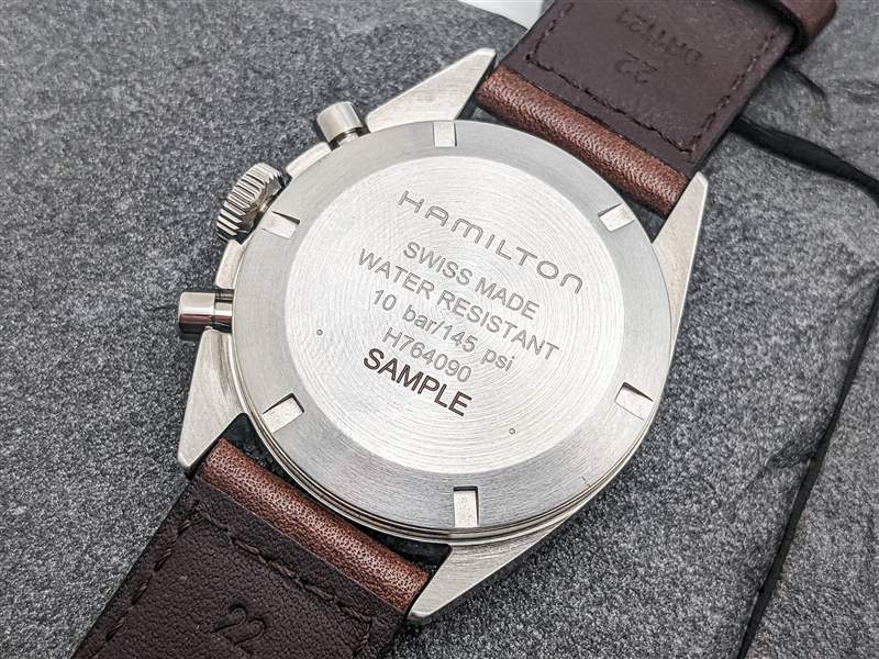 從表面上看,Hamilton Khaki Pilot Pioneer 機械計時碼表的 40 毫米寬不銹鋼表殼看起來干凈、簡單、緊湊。然而,在實踐中,這種實用的表殼設計既提供了大膽的佩戴方式,也提供了手腕上令人驚訝的細微差別。本案的視覺核心是不對稱布局。9 點鐘位置的表殼側面緊密包裹,直接融入平坦光滑的表圈,而 3 點鐘位置的表殼向外彎曲約 2 毫米。與它的 70 年代前身一樣,這是為了保護表冠和簡單的圓柱形按鈕,但不同尋常的設計賦予卡其飛行員先鋒機械計時碼表強健而實用的外觀。這種對干凈、直接功能的強調延伸到全拉絲飾面,只有帶有簽名的表冠和按鈕作為拋光亮點脫穎而出。然而,這種簡單性是手腕上的一把雙刃劍。與原版英國皇家空軍 (RAF) 發行的 6BB 計時碼表一樣,表殼完全采用平面設計,沒有任何倒角或細節,而盒裝藍寶石水晶鏡面進一步提升了這些平面的垂直度。在手腕上,這導致 Khaki Pilot Pioneer Mechanical Chronograph 感覺比其 14.35 毫米厚的尺寸可能暗示的還要厚,但這不一定是壞事。這當然是一款很難藏在袖口下的手表,但其毫不掩飾的厚度有助于賦予手表整體堅固的感覺。為保持其軍事傳統,Hamilton 使這款腕表的堅固底蓋極為簡潔。這里唯一要說的版畫是四行基本的文字,廣告留言廣告信息結束