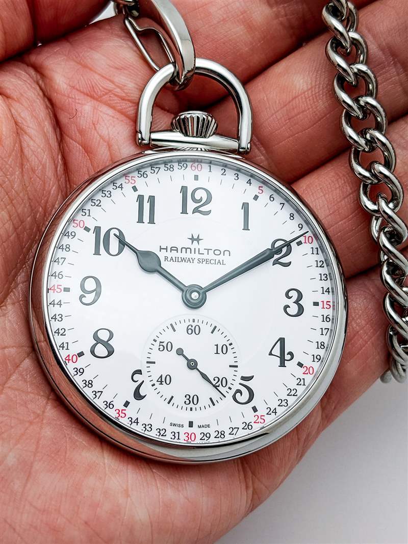 Hamilton 為鐵路懷表配備 ETA 6497-1 手動上鏈機芯。自 60 年代推出以來,6497-1 一直是懷表和腕表生產的中流砥柱,憑借其老派的 18,000 bph 節拍率,它在實踐中捕捉了早期鐵路手表的精神。該機芯還提供穩定的 50 小時動力儲存,但奇怪的是(尤其是對于高精度鐵路計時應用)不會出現故障。然而,在我們的測試期間,6497-1 在精度方面表現出色,平均每天僅 +4 秒。Hamilton 為這款鐵路懷表配上相配的不銹鋼鏈條。雖然簽名的登山扣式端夾在這里可能有點過時,但鏈條堅固且易于固定到皮帶環、夾克口袋、廣告留言廣告信息結束