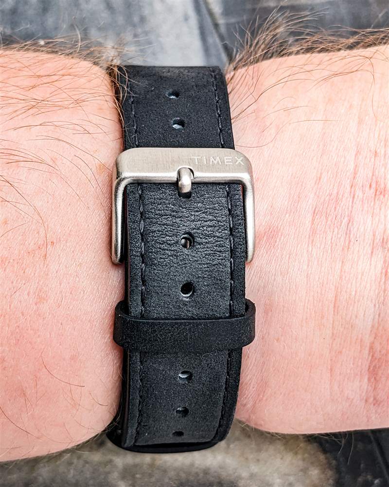 Timex 為 Q Timex 計時碼表配備皮革表帶或不銹鋼多鏈節表鏈。我們的評測樣品采用黑色皮革表帶送達,這條表帶很快成為這款手表最令人印象深刻的功能之一。由位于明尼蘇達州紅翼市的一家美國制革廠聯名打造,開箱即用,帶來柔軟、厚實、柔順的穿著體驗,啞光表面展現出豐富的細微細節。這款表帶在舒適度和美觀方面均能與價格相媲美數倍的手表相媲美,并且非常注重細節,包括帶槽口的末端,讓表帶更順暢地融入表殼的線條。