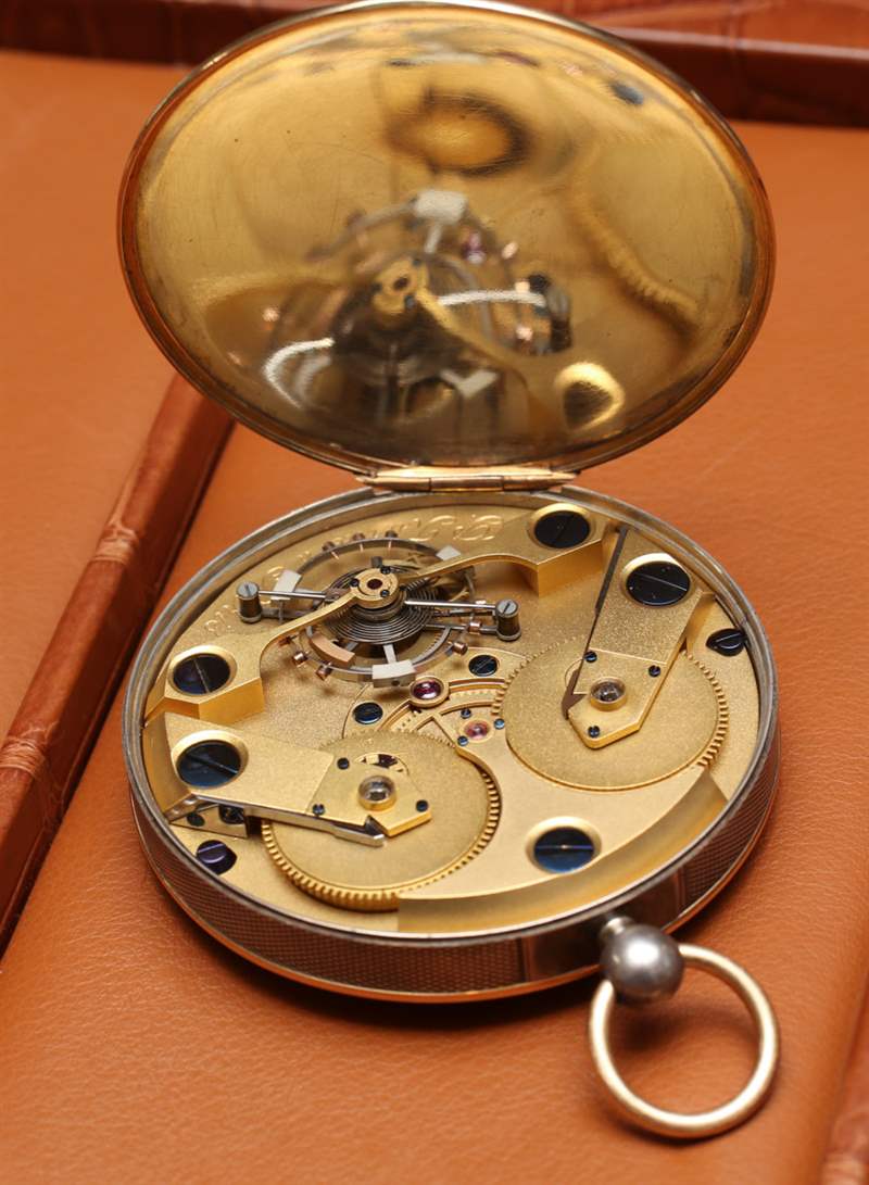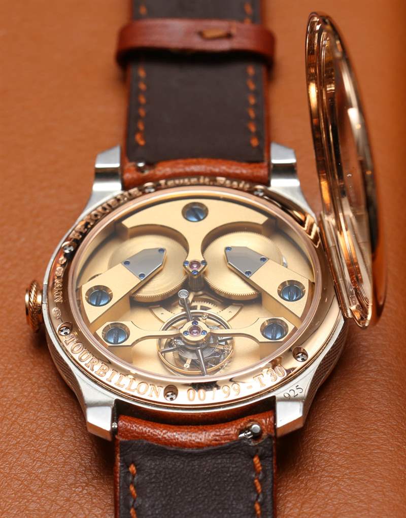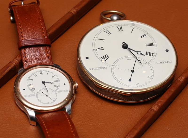 在一個典型的鐘表行業旅行容器中,用來承載最珍貴的貨物,Journe 向我展示了他原創的懷表作品。它在一個透明的塑料盒中,由兩片拉緊的塑料收縮包裝保持相對靜止。就懷表而言,它相當大,您可以立即看出兩件之間的家族相似之處。表盤很簡單,有兩個重疊的時間表盤和一個輔助秒盤。標記印在灰白色的表面上,兩側有兩個螺絲和一點點表盤文字。表殼使用兩種金屬,表圈和底蓋環為 18k 玫瑰金,而表殼的其余部分為 950 純銀,并經過機刻扭索飾紋。腕表和懷表甚至都有獵人式開口表背。
