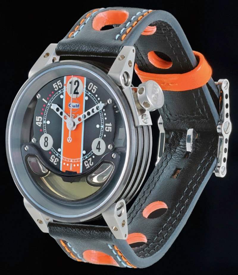 BRM 在 CNT-44-GULF 腕表的表盤上加入了 Gulf 標志和賽車條紋,并在雙對比色縫合皮革表帶中模仿了顏色。不要錯過那些橙色表帶舷窗!
