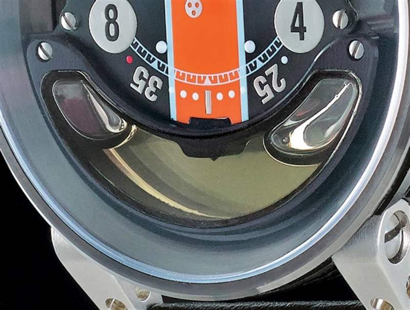 熱愛海灣賽車,??BRM?CNT-44-GULF 手表充滿了機油。眾所周知,大多數機械表機芯中都含有機油,作為機器潤滑的必要組成部分。所以是的,大多數手表里面已經有油了。但不完全是這樣。對于石油大亨和大象(你們這些石油人知道我在說什么),這是一款鐘表,在表盤上用一小容器機油來慶祝優質的黑金。這可能只是 BRM 有史以來對賽車運動最強烈的腕表致敬。