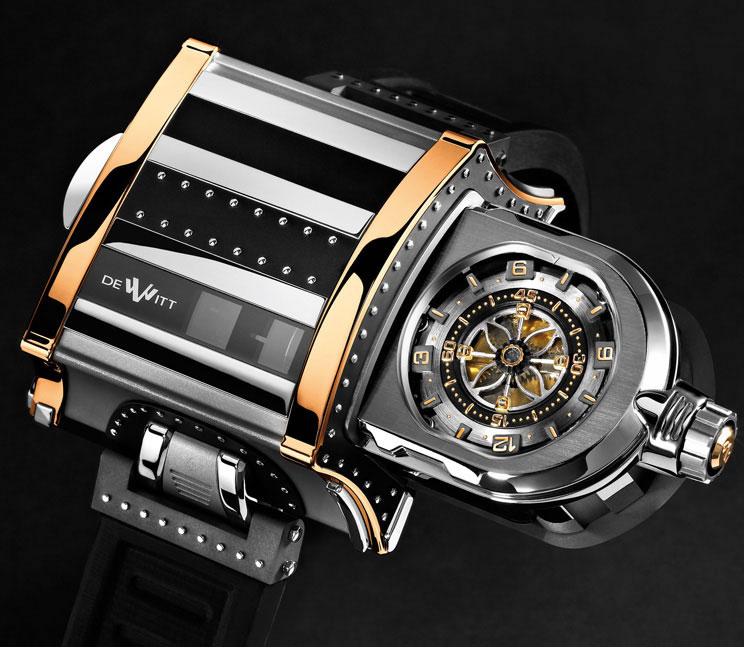 DeWitt著名的狂野 WX-1 是一款適合手腕的蒸汽朋克太空船,它有一個拉出式表殼,可以讓人們進一步檢查復雜的機芯和許多提供 21 天動力儲存的發(fā)條盒。這款手表還有一個側(cè)面安裝的陀飛輪,并設法在羅盤式顯示屏上顯示時間。僅生產(chǎn)了 33 枚 WX-1 手表