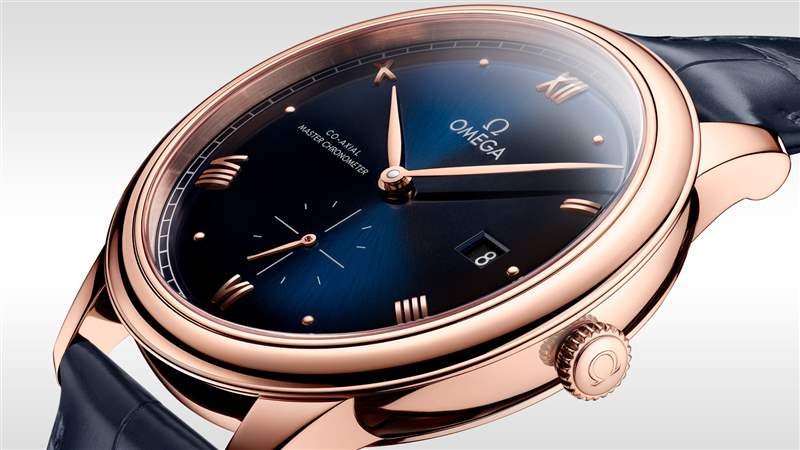 與之對應(yīng)的男表選擇頗多,比如碟飛系列第三代典雅腕表41毫米,由偏紅的 Sedna 18K金制成。這是一種呈現(xiàn)熾烈色調(diào)的18K玫瑰金,同樣由歐米茄獨家研發(fā)制造,其獨特成分包括銅和鈀,以確保顏色持久和穩(wěn)定。這一新型合金的名稱源于被天文學(xué)家稱為 Sedna 的外海王星天體,Sedna 小行星被認為是太陽系中表面顏色最紅的天體之一。拱形的深藍色 PVD 表盤呈現(xiàn)出太陽射線的打磨效果,柳葉形時分指針及6點位的小秒針經(jīng) Sedna 18K 金 PVD 處理,羅馬數(shù)字刻度和弧面形小時刻度交替出現(xiàn),特別文質(zhì)彬彬。